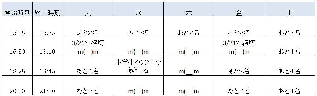 2026年4月4日現在の4月レギュラーコマの空き状況です。