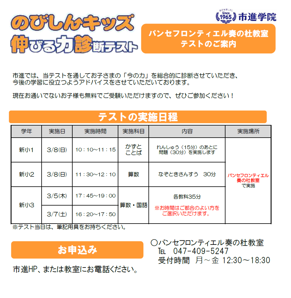 ![]() 上記の日程でテストを実施します! 無料で受験いただけるテストとなっておりますので、ぜひご参加ください! お申し込みは教室までお問い合わせください。 |