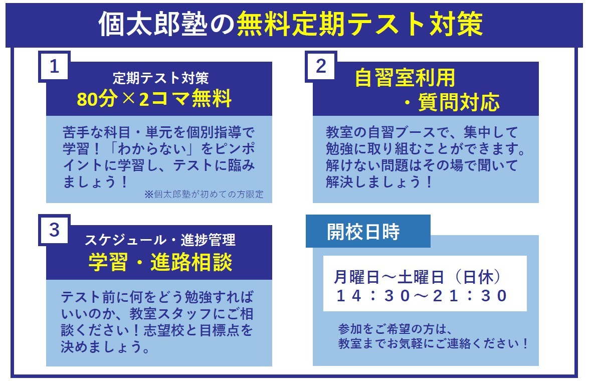 個太郎塾の冬期講習 申込受付中!! ・2学期の復習 ・定期テスト対策 ・新学年新学期の準備 ・苦手科目克服 ・英検Ⓡ対策 お子様に応じた、最適な 学習プランでスタートできます。 個太郎塾が初めての方には、 以下の特典があります。 【冬の学習応援キャンペーン】 最大12時間授業料無料! そして、11月・12月入会の方は、 初回ご請求額より、 最大10,000円(税込)割引 (早割特典) この冬は個太郎塾の講習に 参加し、弱点を克服しよう!! |