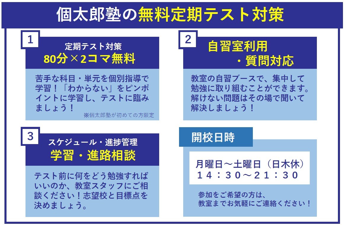 市川四中・市川六中・葛飾中にお通いの方 個太郎塾下総中山教室では、 ご好評につき、9月に実施した 『秋勉祭(定期テスト対策会)』 を次回の定期テストに向けて、 11月にも実施いたします! 【開催日】 11/8(土)・11/15(土)・11/22(土)・11/29(土) →15:00~21:00 11/16(日) →12:00~20:00 秋勉祭は、個太郎塾で 徹底的に・とことん勉強させる 学習イベントです。 普段個太郎塾にお通いでない お子さまも参加できますので、 この機会にぜひ個太郎塾の 「点になる」テスト対策を ご体験ください! 【中学生定期テスト対策】 市川四中テスト対策会 後期中間テスト: 11/18(火)~11/19(水) 【テスト対策日】 11/8(土)・11/15(土)・ 11/16(日) 市川六中テスト対策会 後期中間テスト: 11/20(木)~11/21(金) 【テスト対策日】 11/8(土)・11/15(土)・ 11/16(日) 葛飾中テスト対策会 後期中間テスト: 12/4(木)~12/5(金) 【テスト対策日】 11/22(土)・11/29(土)・ 11/16(日) ★秋勉祭オススメ①★ 的プリ(学校別テスト対策プリント) を解く! お通いの中学校の テスト範囲から作成された予想問題 を解いていきます。 (全教科対応) ★秋勉祭オススメ②★ 学校のワークの質問し放題! 学校のワークをなかなか1人では 進められないキミも、この夏勉祭で 範囲を終わらせましょう! (全教科対応) ★秋勉祭オススメ③★ 英語学習チャレンジ! 英語の苦手な単元を、 テストで確認・復習! 中3は受験に必ず出る 英作文を対策! その他にも、たくさん成績アップに 向けた取り組みを行っています。 詳しくは教室までお問合せください。 |