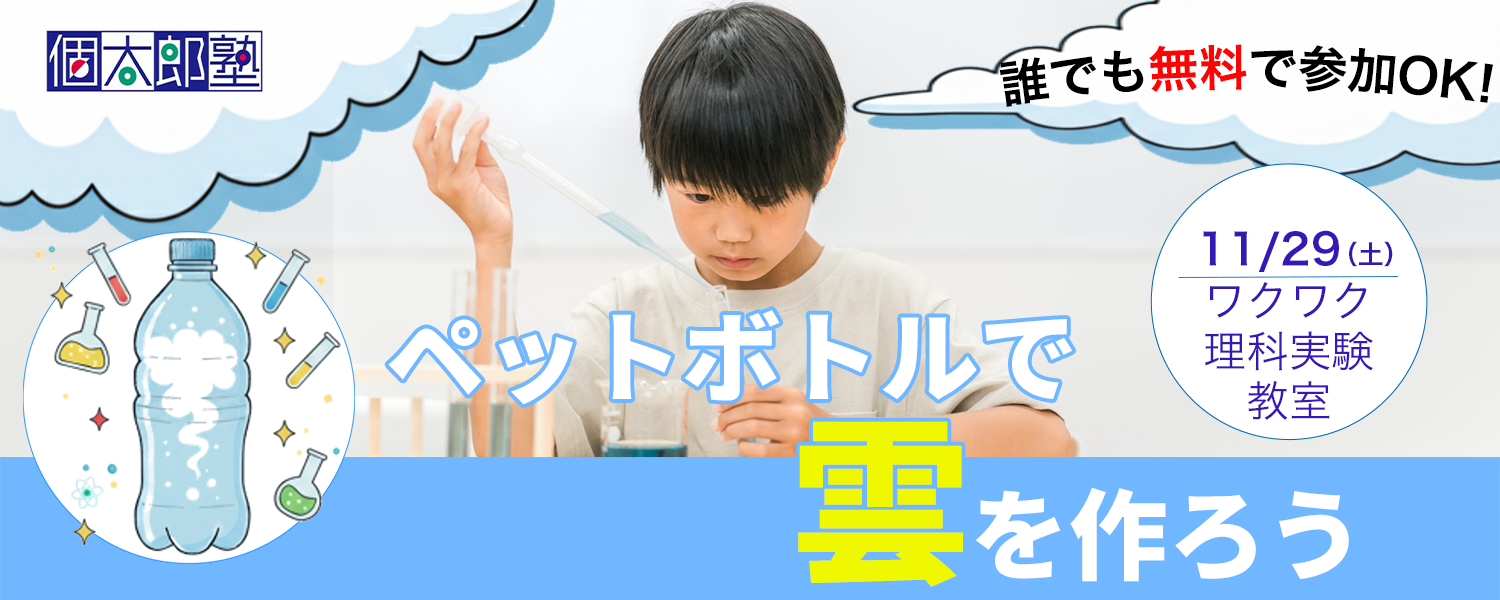 ![]() 小学生のみなさんへ 個太郎塾八千代台教室では、 ★ペットボトルで雲をつくろう! ワクワク理科実験教室★ を開催することになりました! 皆さんは、空に浮かぶ雲は どうやってできているのか、 不思議に思ったことは ありませんか? ペットボトルの中に雲を作る 実験をして、どのように雲が できるのかを、 個太郎塾で学習しましょう! 詳しくは特設HPをご覧ください! 【日時】 11月29日(土) 12:00~13:00 【場所】 個太郎塾 渋谷本町教室 【持ち物】 ペットボトル (500mL、炭酸が入っていたもの) 【参加費】 無料 【予約方法】 下記のいずれかの方法で お申し込みをお願いいたします。