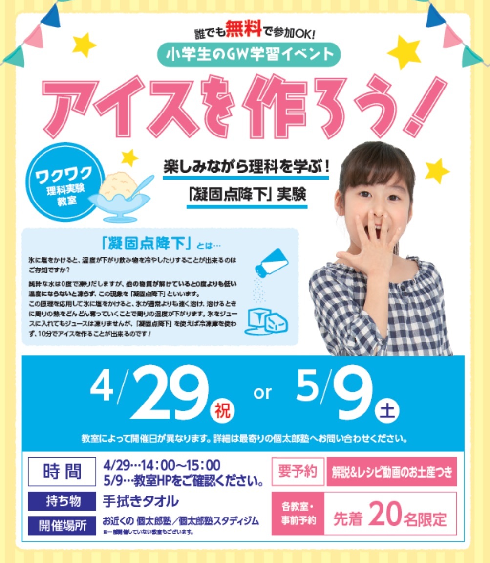 小学生の皆さんへ こんにちは! この度、個太郎塾柏の葉教室では ★アイスを作ろう!「理科実験」イベント★ を開催することになりました。 アイスを作りながら、「凝固点(氷点)降下」について一緒に楽しく学びましょう!! 【日時】5/9(土) 11:30~12:30 【場所】個太郎塾柏の葉教室 【持ち物】手拭きタオル 【予約方法】教室へ℡にてご連絡ください。 電話番号:04-7157-4462(定休日:日曜日) ※材料の準備の関係で、必ずご予約が必要になりますので、教室までお問い合わせください。 |