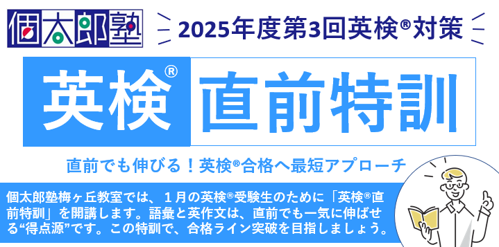 個太郎塾梅ヶ丘教室では、1月の英検®受験生のために「英検®直前特訓」を開講します。語彙と英作文は、直前でも一気に伸ばせる“得点源”です。この特訓で、合格ライン突破を目指しましょう。