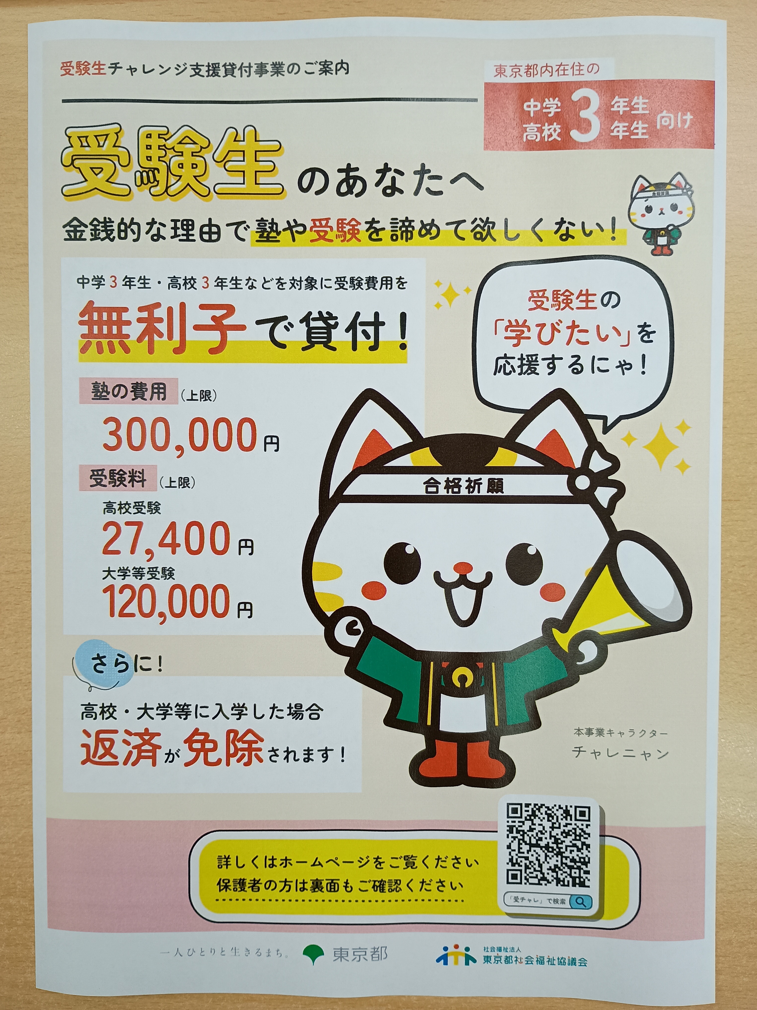 東京都内在住の受験生は、世帯所得要件などを満たせば「受験生チャレンジ支援貸付事業」が利用できますね。学習塾の受講料や受験料に対する無利子の貸付で、無事進学が叶えば返済が免除になる(例年99%が免除)ため、子どもの受験挑戦を支援する心強い制度ですね。