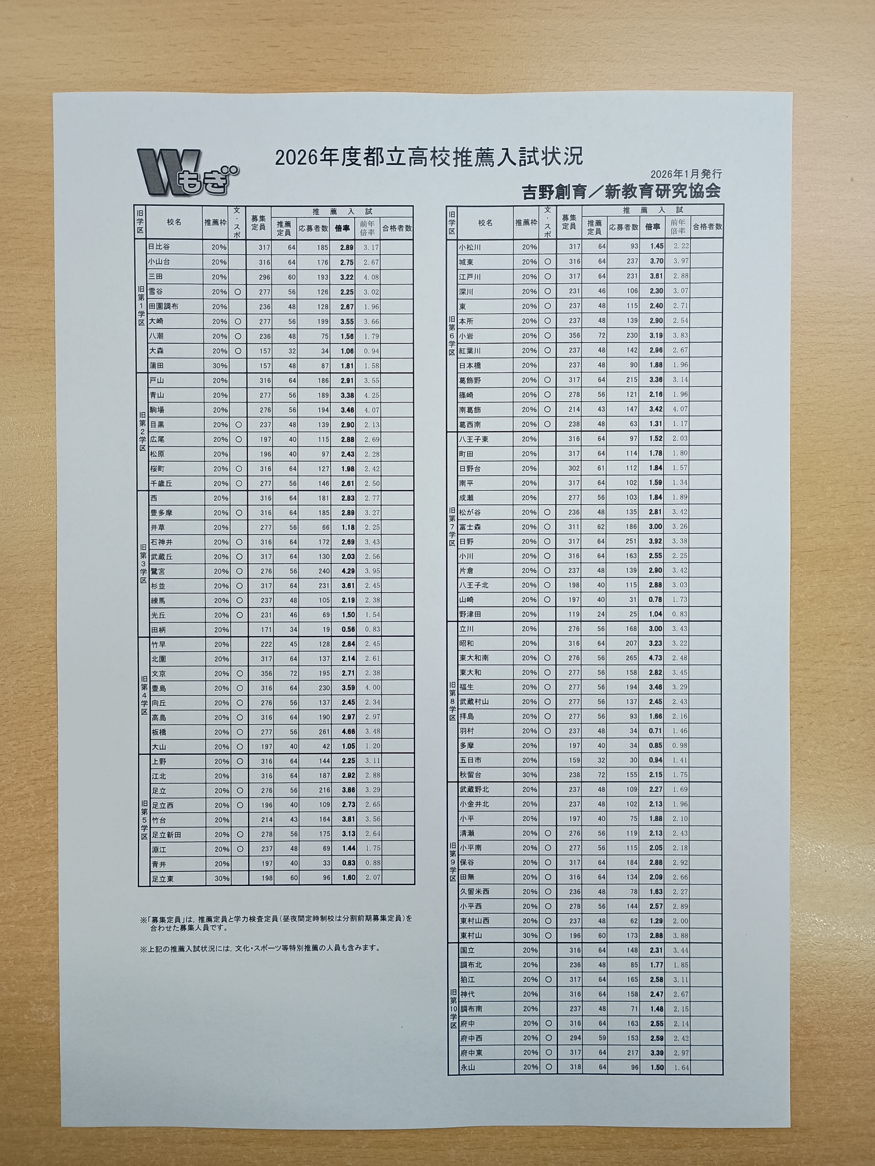 共通テストが英・国・世の合計で8割を突破。英語は、リーディングだけでなくリスニングも揃って8割を超えました。「共テ利用」での合格圏内は確保したので、本命校対策にフルコミットできます。受験生の力は入試直前まで伸び続けます。一緒に駆け抜けましょう。 2026年1月20日 都立推薦入試倍率が発表されました。応募倍率は普通科全体で2.49倍。