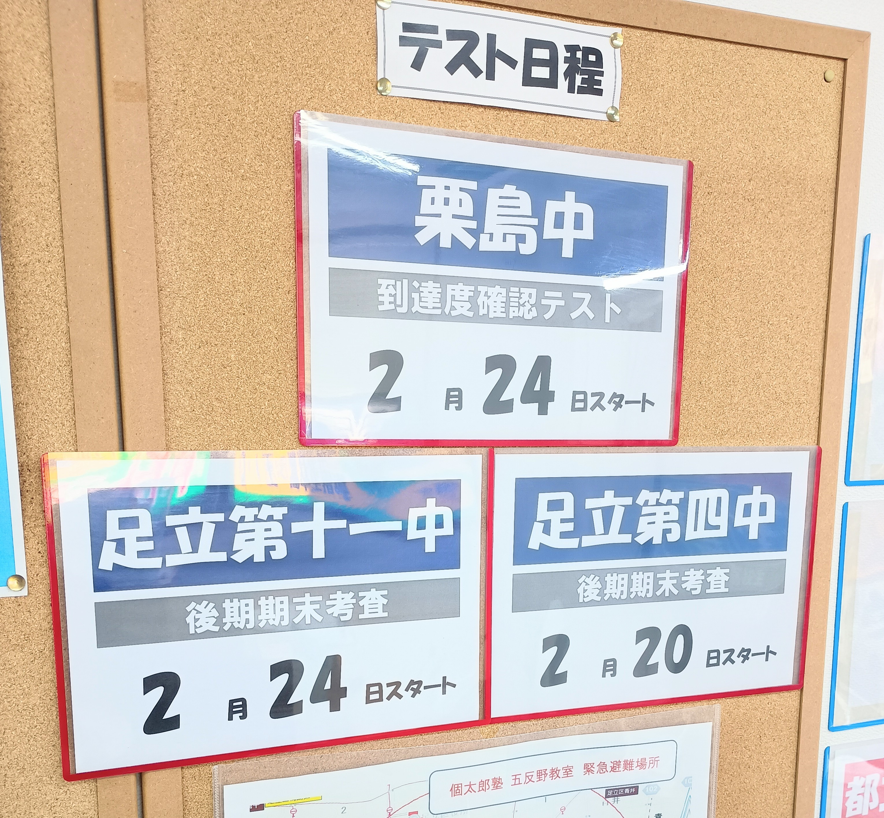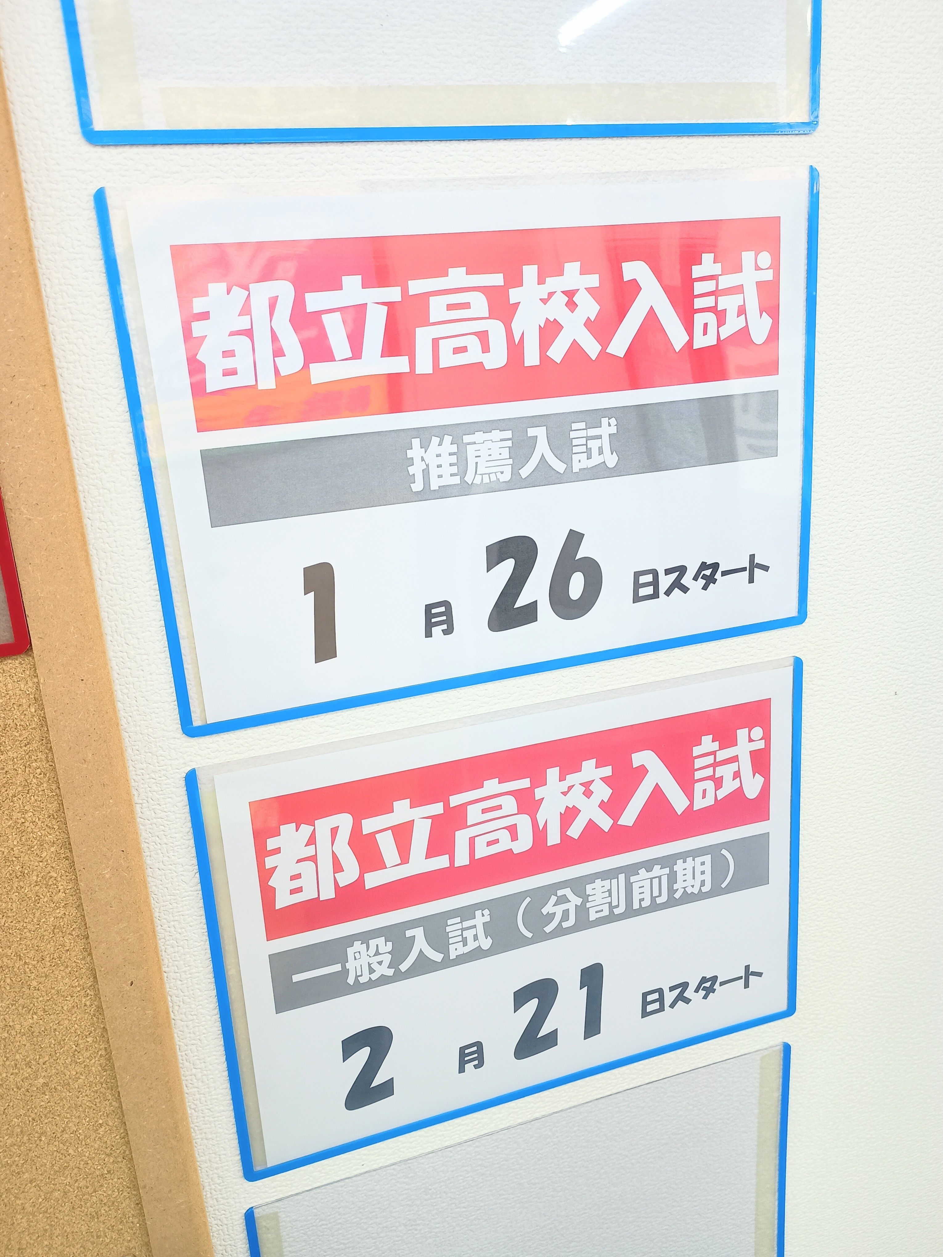 2026年1月31日 本日は、都立高校受験に向けた直前対策模試を実施しています。都立一般入試まであと21日。自分の実力と真摯に向き合い、得点力を正確に把握することで、足りない部分を確実に補強していきましょう。 2026年1月29日 いよいよ定期試験が目前に迫ってきましたね。1月中に全単元の学習を完了させ、2月からは実践的なテスト対策の時期。総合形式の問題に自力で挑み、正解を導き出せるようになってこそ、その力は本物になりますね。 2026年1月26日 今日は都立推薦入試、本当にお疲れ様でした!明日、面接やスポーツ実技などが控えている人は、最後まで全力で頑張ってください。