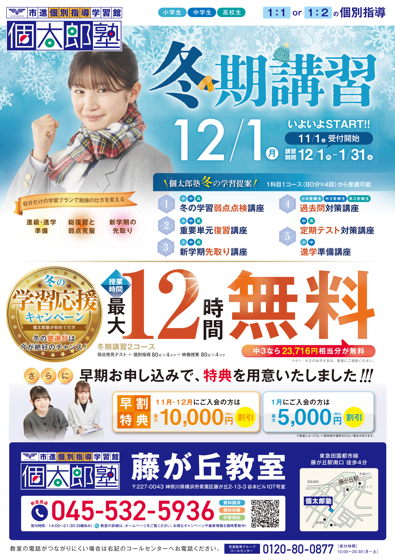 個太郎塾の個別指導では、生徒ごとに合わせた最適な授業で、 日々の復習から受験勉強 まで 全面的にバックアップ ! 保護者様やお子様の お悩み・希望をシッカリお伺い したうえで、指導内容をご提案いたします。 無料体験授業を複数回体験 いたただけますので、是非、個太郎塾藤が丘教室をご体験ください! お申込み・お問い合わせ何か気になる点、ご不明点がございましたら、お気軽にご連絡ください。お電話お待ちしております。 個太郎塾 藤が丘教室 月~土 14:00 ~ 21:30