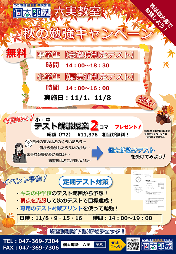 中・高・大の受験、定期テストの成績アップ、英検などの検定受検などそれぞれ目標に向かって頑張りましょう。特に受験学年の生徒の皆さんは、いつまでに何をするか、スケジュールがとても大事です。私たち個太郎塾スタッフ一同、皆さんとともに考え、一緒に努力します。不安なこと何でも相談してください。