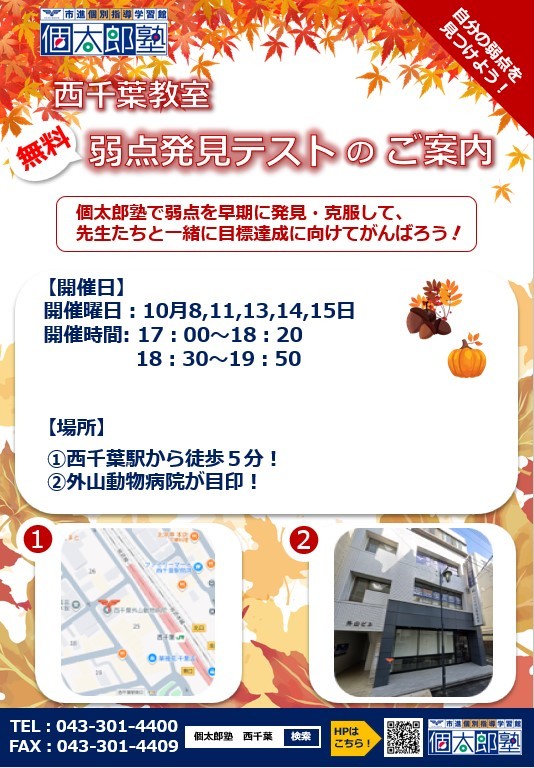 お問い合わせは個太郎塾西千葉教室まで(☎043-301-4400)
