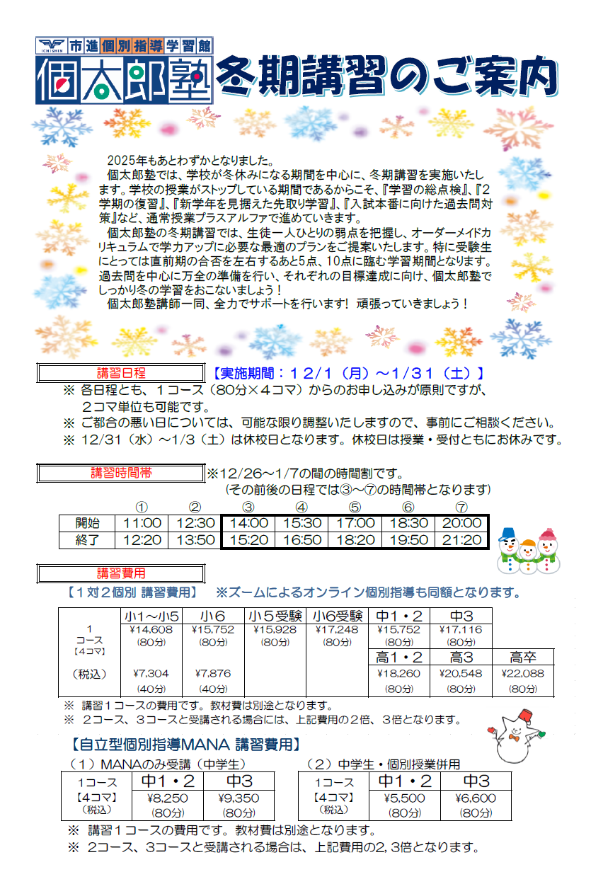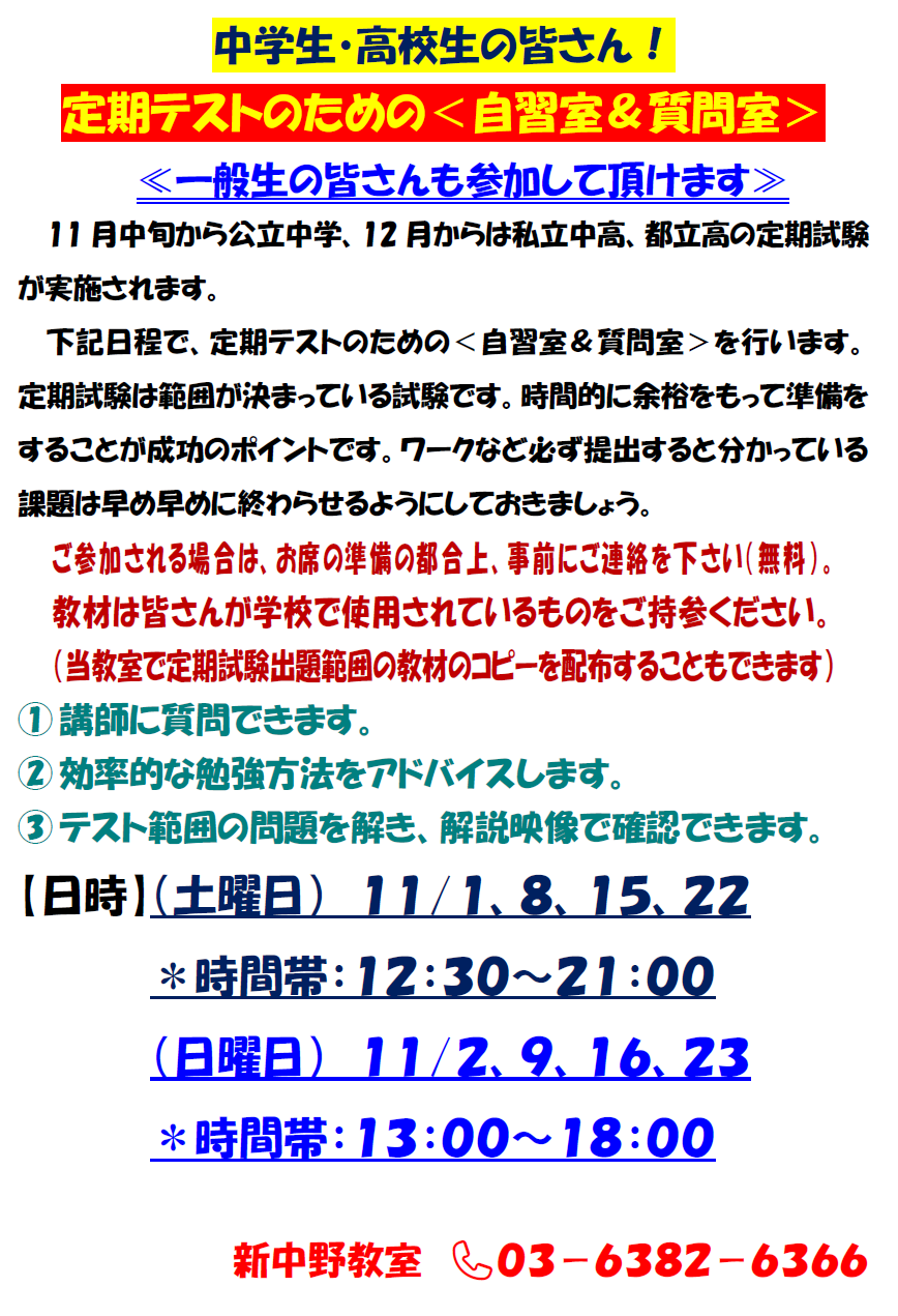 | 冬期講習 受付開始! | 11月 土・日の定期テスト対策のための“自習... | ★個太郎塾 新中野教室のご紹介 |