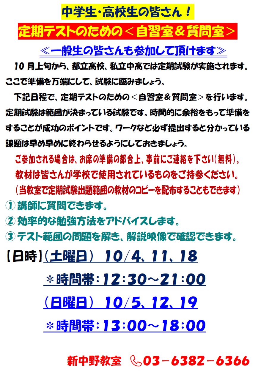 個太郎塾 新中野教室では、在籍されている全ての公立中学、私立中高、都立高校の定期テストの2週間前から「定期テストのための質問室&自習室土曜日、日曜日に開催しています。時間帯は土曜日が12時30分から22時まで、日曜日が13時から18時までです。
