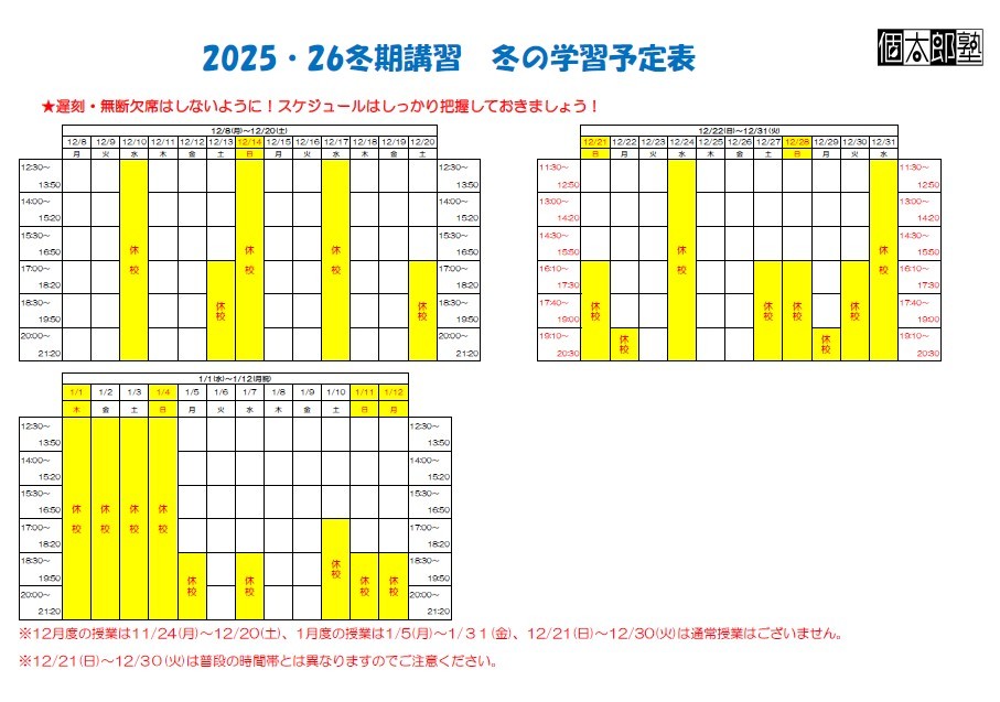 | 冬期講習日程 | 個別指導の冬期講習 | 【2026春】 合格実績 2025.12.1... |