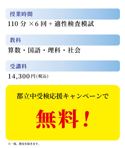 入会金無料・初月完全無料ともに「国私立中学受験コースの小6、公立中高一貫校受検コースの小6および中3、高3は対象外」となります。