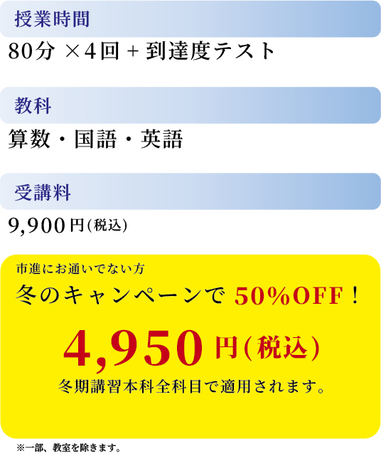 - 東京エリアの市進学院では、一部を除く教室で、別途キャンペーンを実施しています。こちらから詳細をご確認ください。