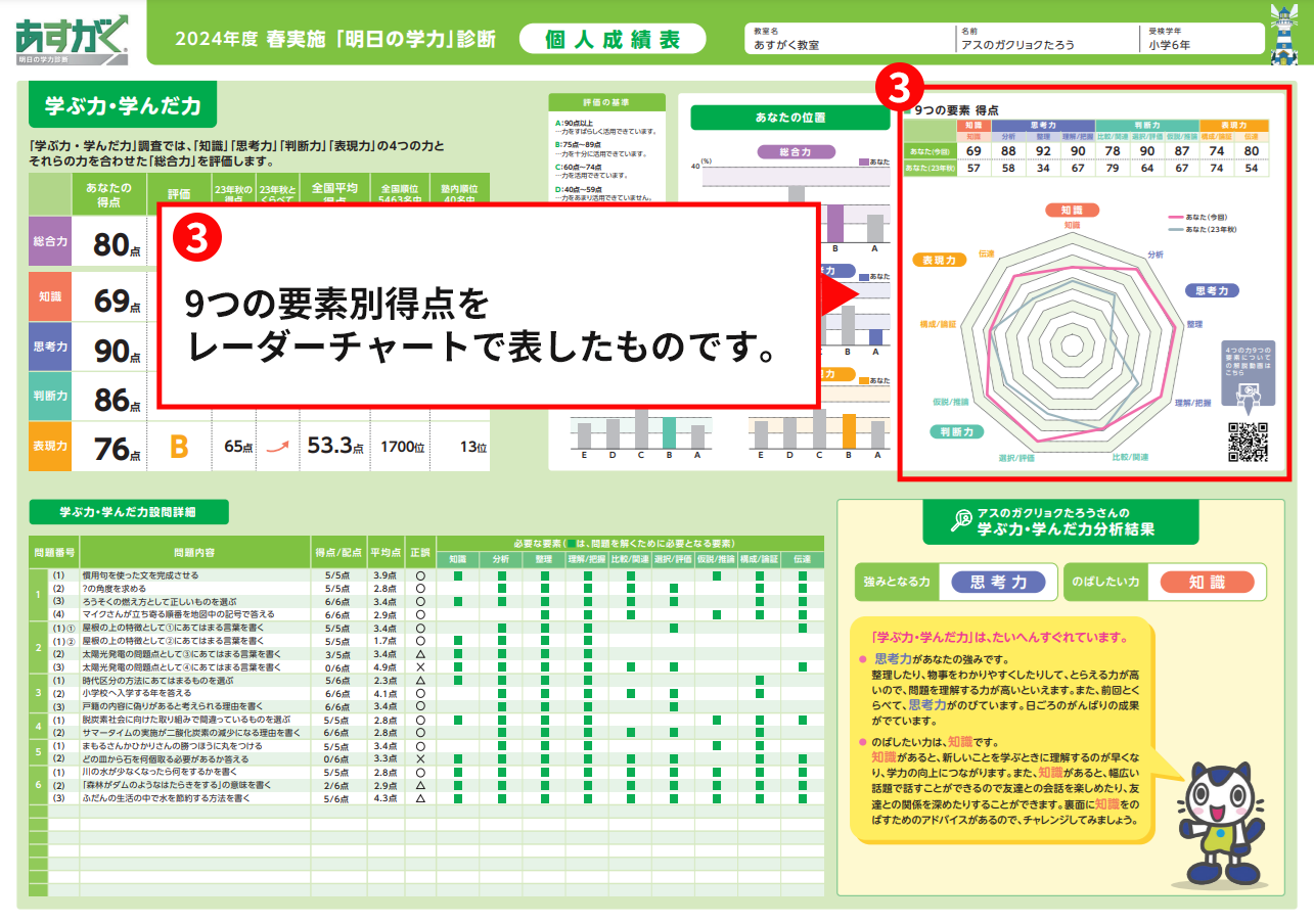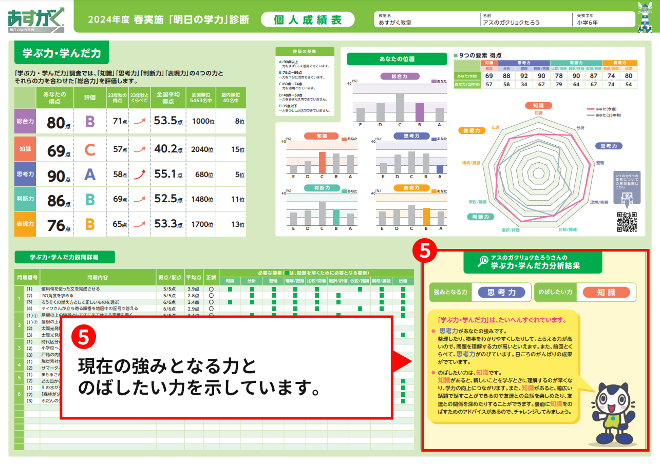 全国・塾内での順位や学力を多角的に把握し、読解力・思考力・表現力を評価。