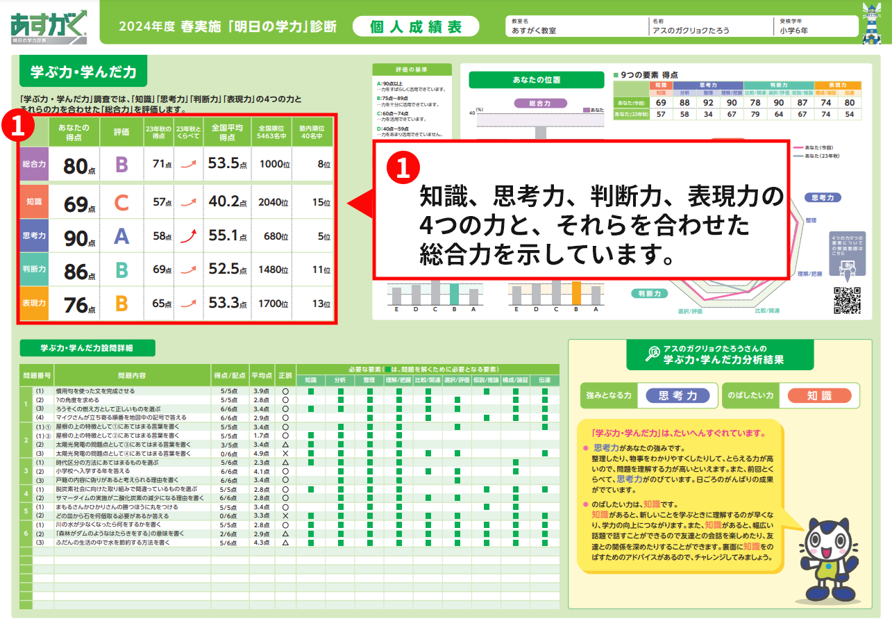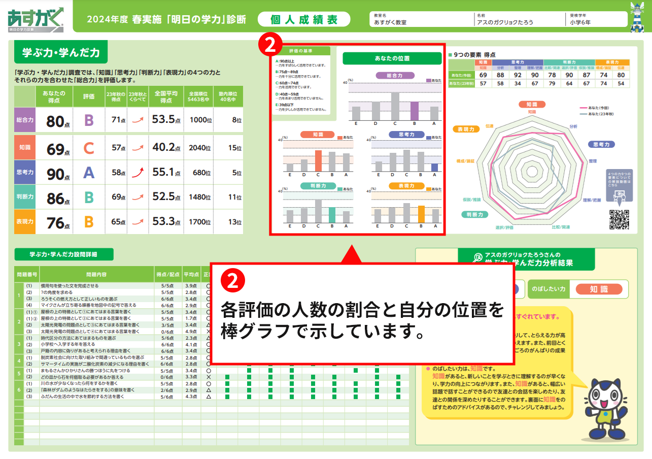 全国・塾内での順位や学力を多角的に把握し、読解力・思考力・表現力を評価。