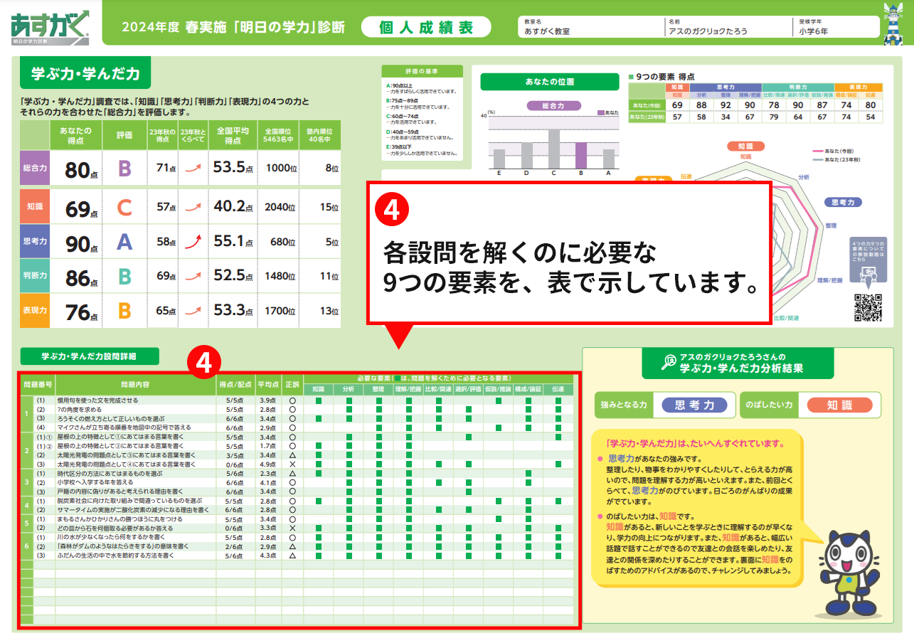 | 特長2 | [国語・算数][数学・英語]の到達度に加え、近年の入試で重視される 「読解力」「思考力」「表現力」を判定。 |